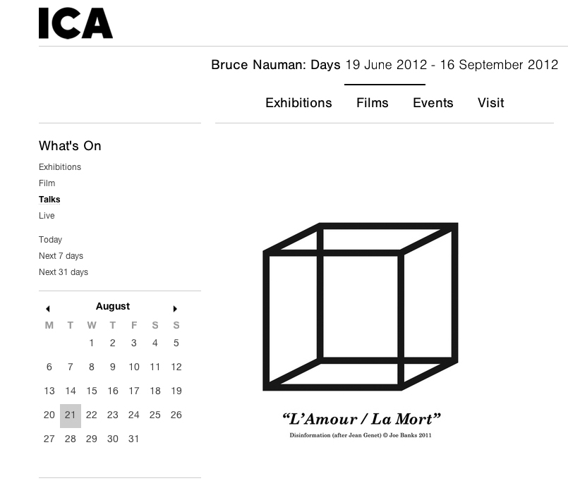 Rorschach Audio talk at the Liverpool Biennial, 6 Oct 2012, organised by Mercy, and at The ICA, London, 15 Sept 2012 (as part of the closing events for Bruce Nauman’s exhibition “Days”) – click on the highlighted texts for details
