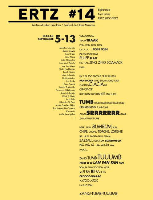 The ERTZ festival features a Disinformation concert & “Rorschach Audio” lecture, also Maialen Lujanbio, Xabier Erkizia, Iban Urizar, Aitor Nova, Asier Gogortza, Jose Mari Zabala, Jose Luis Maire, Colin Hacklander, Farah Hatam, Idoia Zabaleta, Peter Cusack, Jakoba Errekondo, Fernando Mikelarena, Jose Luis Espejo, Mikel R Nieto, Luca Rullo, Eduardo Gil Bera, Karlos Sanchez Ekiza, ALKU / Roc Jimenez de Cisneros, Khantoria & Ander Berrojalbiz. Brochure, in Basque and Spanish –