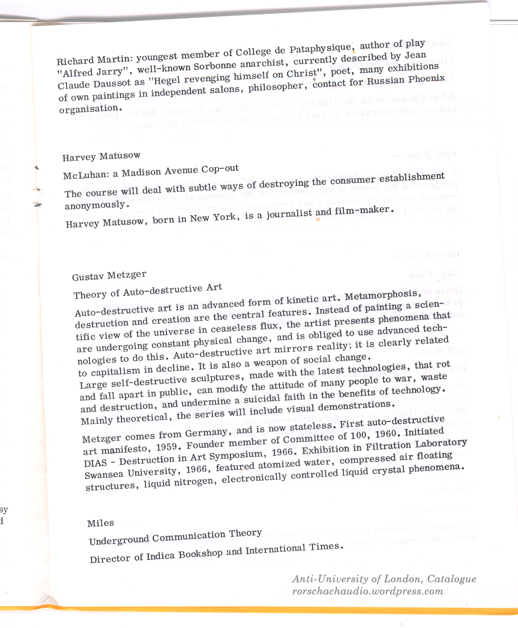 The 2nd catalogue advertised Pop Art pioneer and former electrical draughtsman Richard Hamilton, as giving 2-hour lectures on the art of Marcel Duchamp, and International Times founder (now cultural historian) Barry Miles as lecturing on “Underground communications theory”, and Yoko Ono as lecturing on “The Connection” (reserving however “the right to interview and choose a limited number of students before the session begins”). In relation to the general subject matter of the “Rorschach Audio” project, it’s also interesting to note the 3rd catalogue advertised (medical doctor and peace activist) Rachel Pinney as offering courses in “Creative Listening”. John Keys was lecturing on… (one word)… “Everything”!