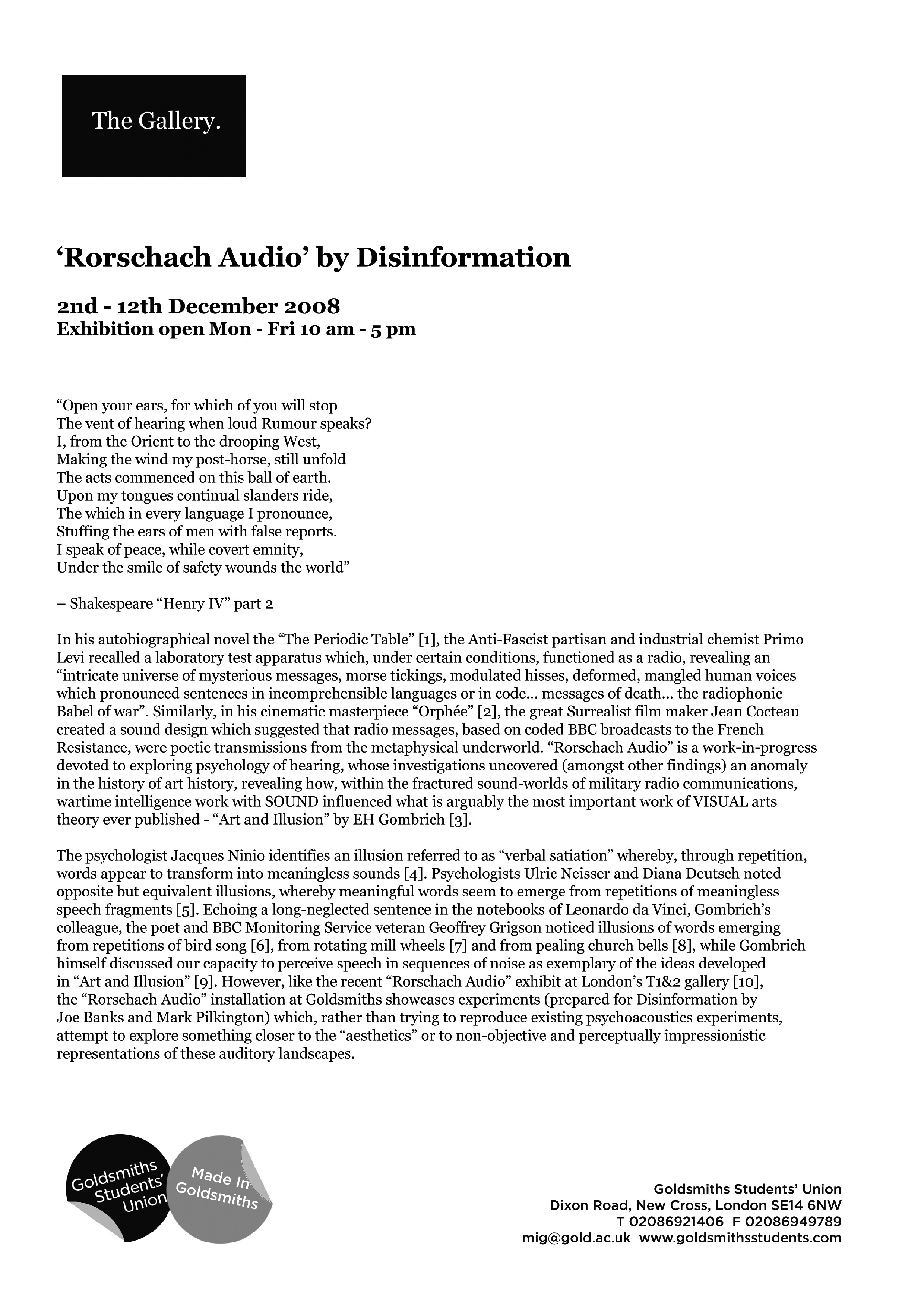 Judging by the number of LPs and CDs whose sleeve-notes offer their apologies to “anyone we forgot”, mistakes like this are all too common, however that makes it no less embarrassing to have omitted acknowledgement for Dr Marq Smith in the “Rorschach Audio” book. Marq Smith is the director of The Institute for Modern & Contemporary Culture at The University of Westminster and founder of The Journal of Visual Culture, without Marq’s encouragement the “Rorschach Audio” project would not have been hosted by The University of Westminster, hence the book project would not have been brought to a successful conclusion. So, until an opportunity arises to thank Marq properly in print… thanks Marq… much appreciated!