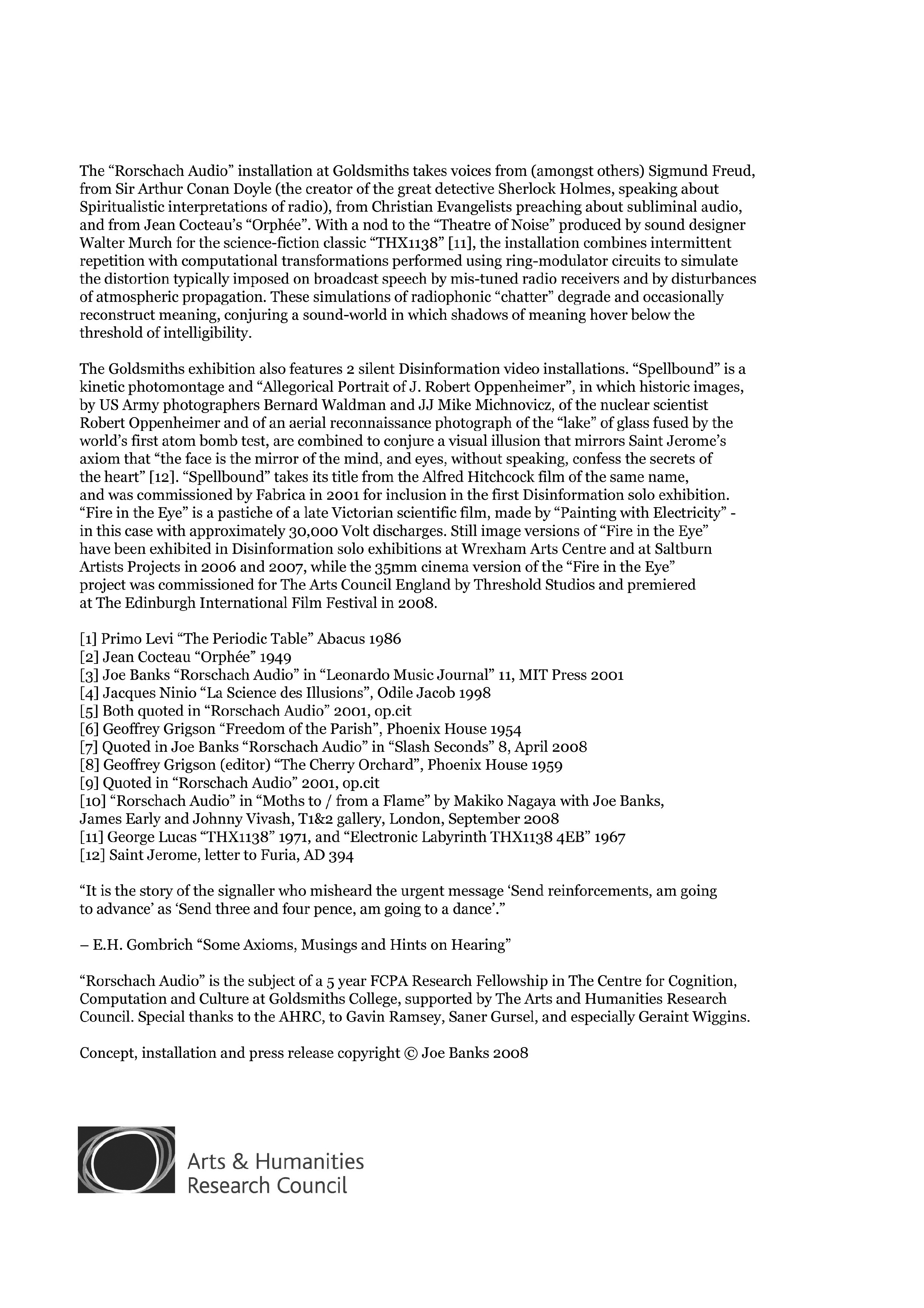 As regards the issue of whether the factual claims made by EVP and ghost-voice researchers are actually true or not, particularly in relation to the question of exploiting the bereaved, arguably the motives of EVP artists who prefer to remain neutral or to not express opinions about this, are even more questionable than those who openly support EVP (at least the genuine EVP believers are being honest). Rather than taking the opportunity to engage with any of Rorschach Audio’s substantive critique however, some individuals prefer to suggest that I criticise these artists because I’m jealous of their success. To set the record straight, I happily admit to having participated in a culture of healthy (intellectual and professional) competition among sound artists, and to being jealous of artists like Martin Creed (whose success I honestly believe is undeserved), but (even though I work very hard on my projects) I respect artists who’ve done well because they too work hard – there are plenty of them, and this book criticises no-one for being successful, it only criticises people for talking nonsense. The paradox is that if anything, far from being jealous, if only for practical reasons I am in fact grateful to those artists whose cynicism and/or gullibility with regard to EVP has given me, on a plate, way and ahead the most lucrative project I’ve ever undertaken! One extra point, that wasn’t made in the “Rorschach Audio” book, is that an alleged manipulation of audio recordings to create false hope that a dead person might have still been alive, was considered so unethical as to have made world-wide news and forced the closure of a national newspaper. Think about it.